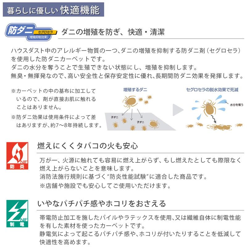 アレルギーの原因の一つとされるダニの増殖を抑制する防ダニ加工や、店舗や施設でも安心してお使いいただける防炎加工も施されています。