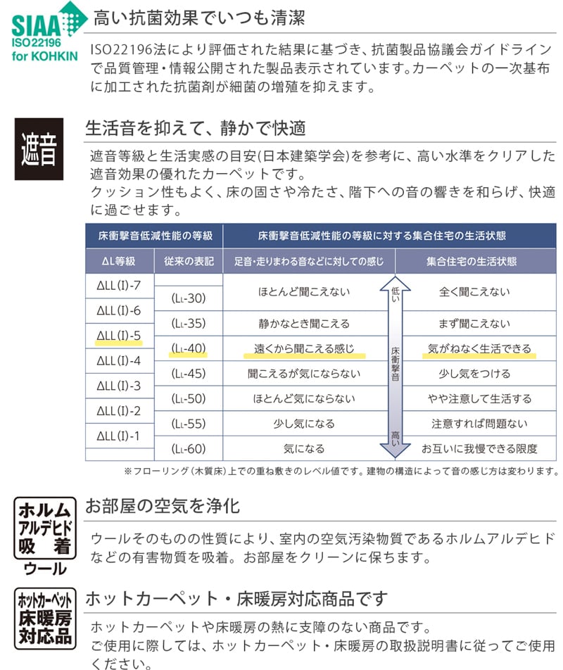 また、アレルギーの原因の一つとされるダニの増殖を抑制する防ダニ加工をはじめ、防虫・制電・遮音など機能面も充実。