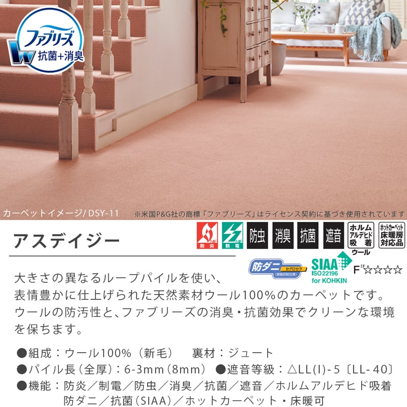 廊下カーペット 廊下敷き マット 幅70cm×長さ120cm ファブリーズ カーペット「消臭+抗菌」のダブル効果でイヤな臭いの元を90%以上カット!優しい色合いの天然素材ウール100% 無地 ループ カーペット全4色 防炎ラベル付『アスデイジー/DSY』