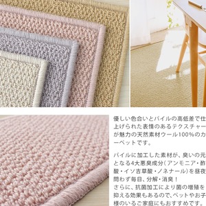 優しい色合いと大きさの異なるループパイルの高低差で仕上げられた表情のあるテクスチャーが魅力の天然素材ウール100%のカーペットです。