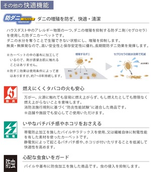 また、アレルギーの原因の一つとされるダニの増殖を抑制する防ダニ加工をはじめ、防虫・制電・遮音など機能面も充実。