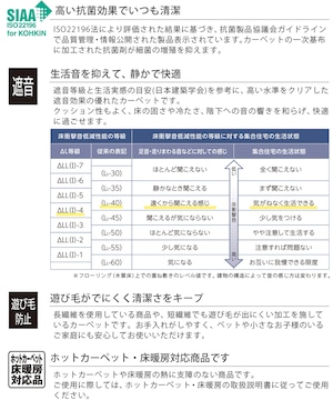 遊び毛の出にくい素材でお手入れがしやすく、また、アレルギーの原因の一つとされるダニの増殖を抑制する防ダニ加工をはじめ、店舗や施設でも安心してお使いいただける防炎加工も施されています。