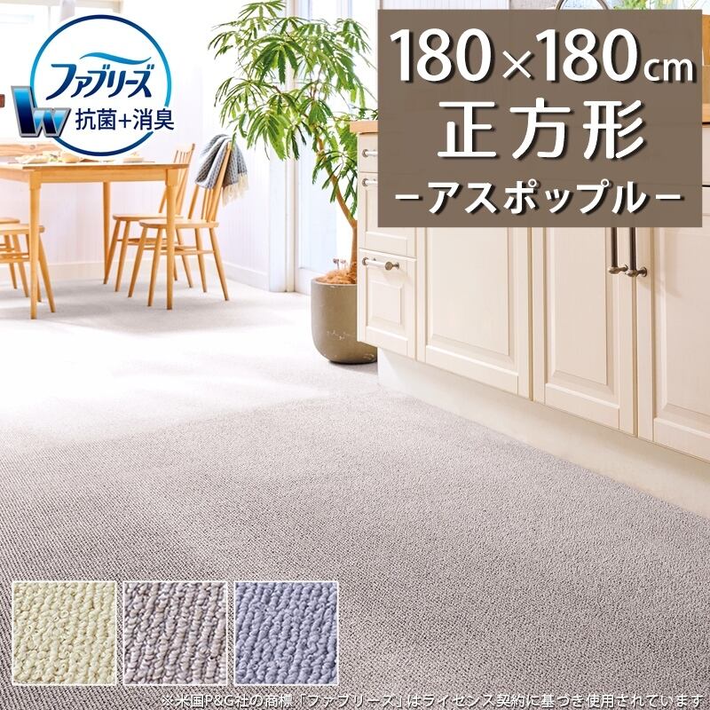 ラグマット ラグ 正方形 180×180cm ファブリーズ カーペット「消臭+抗菌」のダブル効果でイヤな臭いの元を90%以上カット!インテリアコーディネートしやすいシンプルな無地ループタイプ 全3色 防炎ラベル付『アスポップル/PPL』