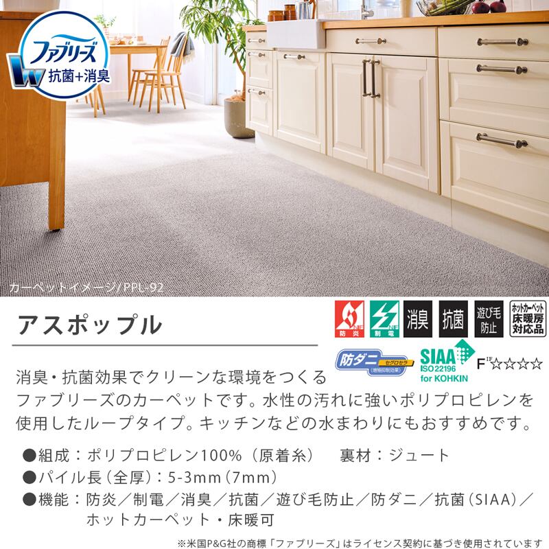 廊下カーペット 廊下敷き マット 幅80cm×長さ180cm ファブリーズ カーペット「消臭+抗菌」のダブル効果でイヤな臭いの元を90%以上カット!インテリアコーディネートしやすいシンプルな無地ループタイプ 全3色 防炎ラベル付『アスポップル/PPL』