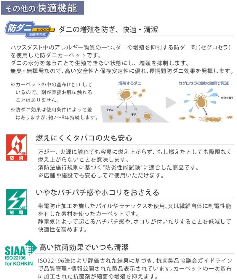 遊び毛の出にくい素材でお手入れがしやすく、また、アレルギーの原因の一つとされるダニの増殖を抑制する防ダニ加工をはじめ、店舗や施設でも安心してお使いいただける防炎加工も施されています。