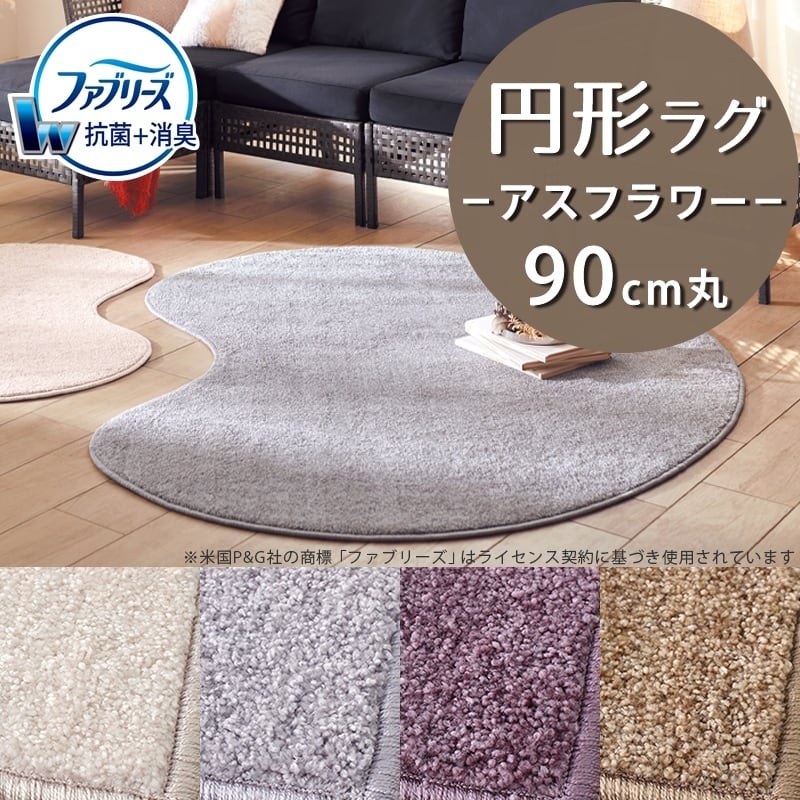 ラグマット 円形 円型 90cm 丸 ファブリーズ カーペット「消臭+抗菌」のダブル効果でイヤな臭いの元を90%以上カット!なめらかなタッチと艶やかで上品な光沢感♪耐久性の高いナイロン素材 カットカーペット 全4色 防炎ラベル付『アスフラワー/FLW』