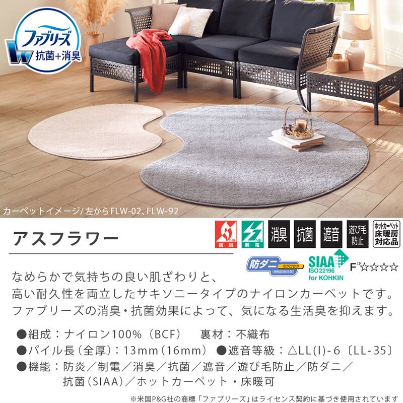 ラグマット 円形 円型 130cm 丸 ファブリーズ カーペット「消臭+抗菌」のダブル効果でイヤな臭いの元を90%以上カット!なめらかなタッチと艶やかで上品な光沢感♪耐久性の高いナイロン素材 カットカーペット 全4色 防炎ラベル付『アスフラワー/FLW』