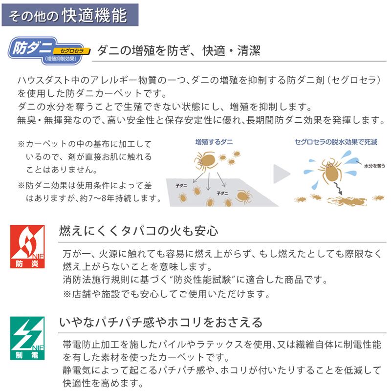 遊び毛の出にくい素材でお手入れがしやすく、また、アレルギーの原因の一つとされるダニの増殖を抑制する防ダニ加工をはじめ、店舗や施設でも安心してお使いいただける防炎加工も施されています。