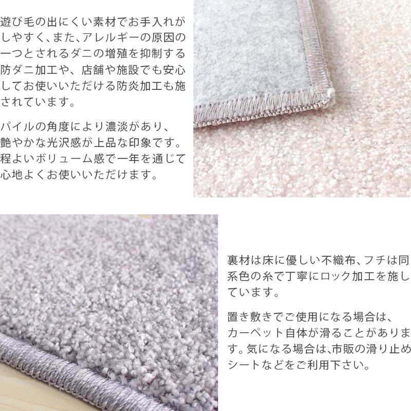 遊び毛の出にくい素材でお手入れがしやすく、また、アレルギーの原因の一つとされるダニの増殖を抑制する防ダニ加工をはじめ、店舗や施設でも安心してお使いいただける防炎加工も施されています。