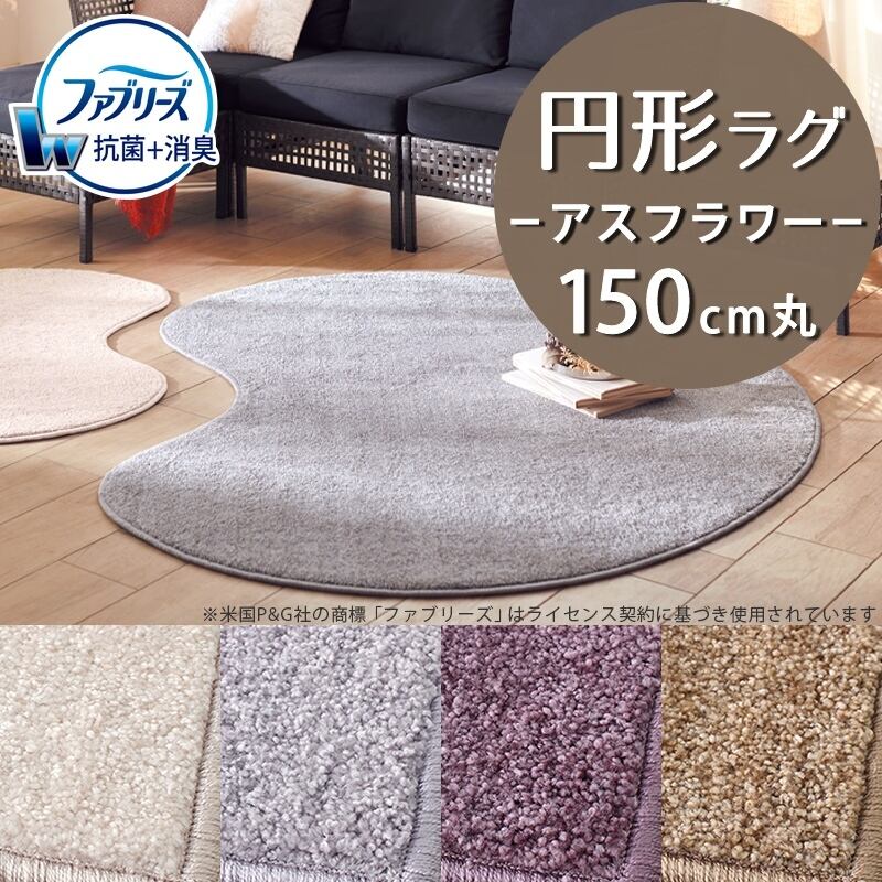 ラグマット 円形 円型 150cm 丸 ファブリーズ カーペット「消臭+抗菌」のダブル効果でイヤな臭いの元を90%以上カット!なめらかなタッチと艶やかで上品な光沢感♪耐久性の高いナイロン素材 カットカーペット 全4色 防炎ラベル付『アスフラワー/FLW』