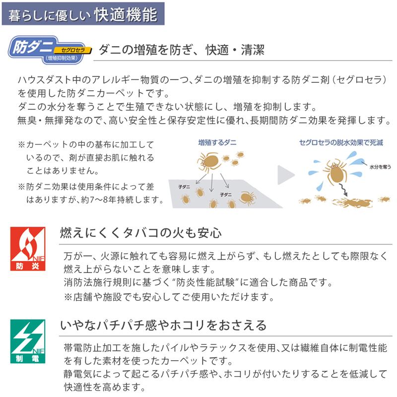 アレルギーの原因の一つとされるダニの増殖を抑制する防ダニ加工をはじめ、防虫・制電・遮音など機能面も充実。