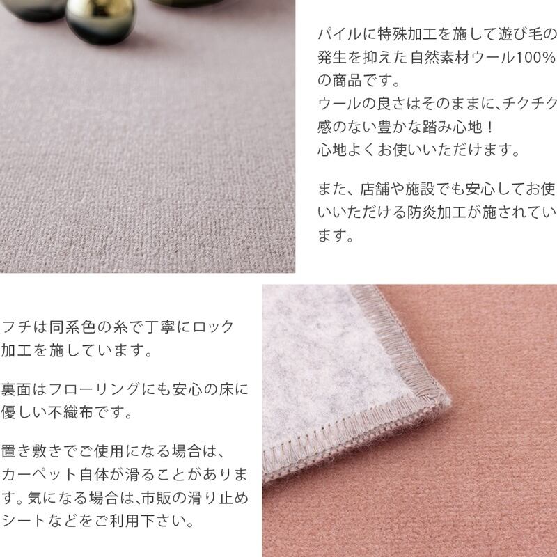 パイルに特殊加工を施して遊び毛の発生を抑えた自然素材ウール100%の商品です。