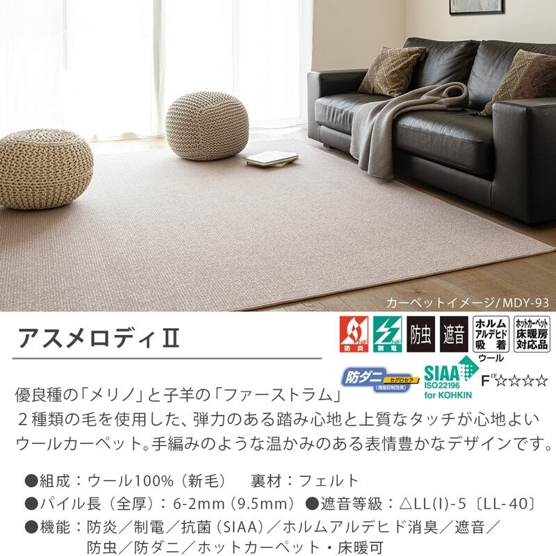 肌触りのよさと高い弾力性をもつ優良種の「メリノ」と、ふっくらと柔らかな風合いが特長の子羊の「ファーストラム」、2種類の毛を使用した高品質なウールカーペットです。