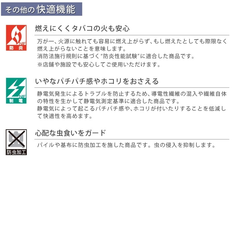 消臭機能のほかに、店舗や施設でも安心してお使いいただける防炎機能をはじめ、防虫・制電などの機能も施されています。